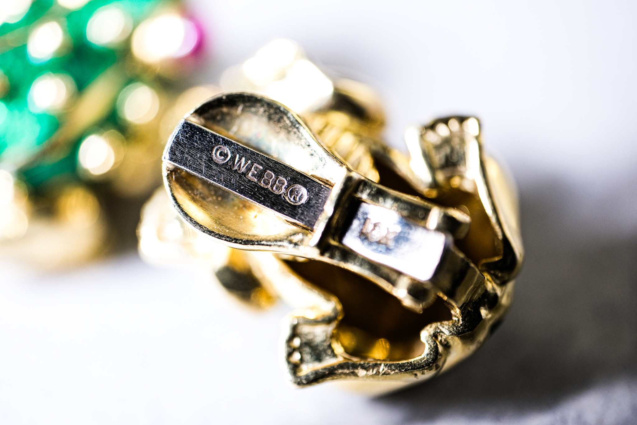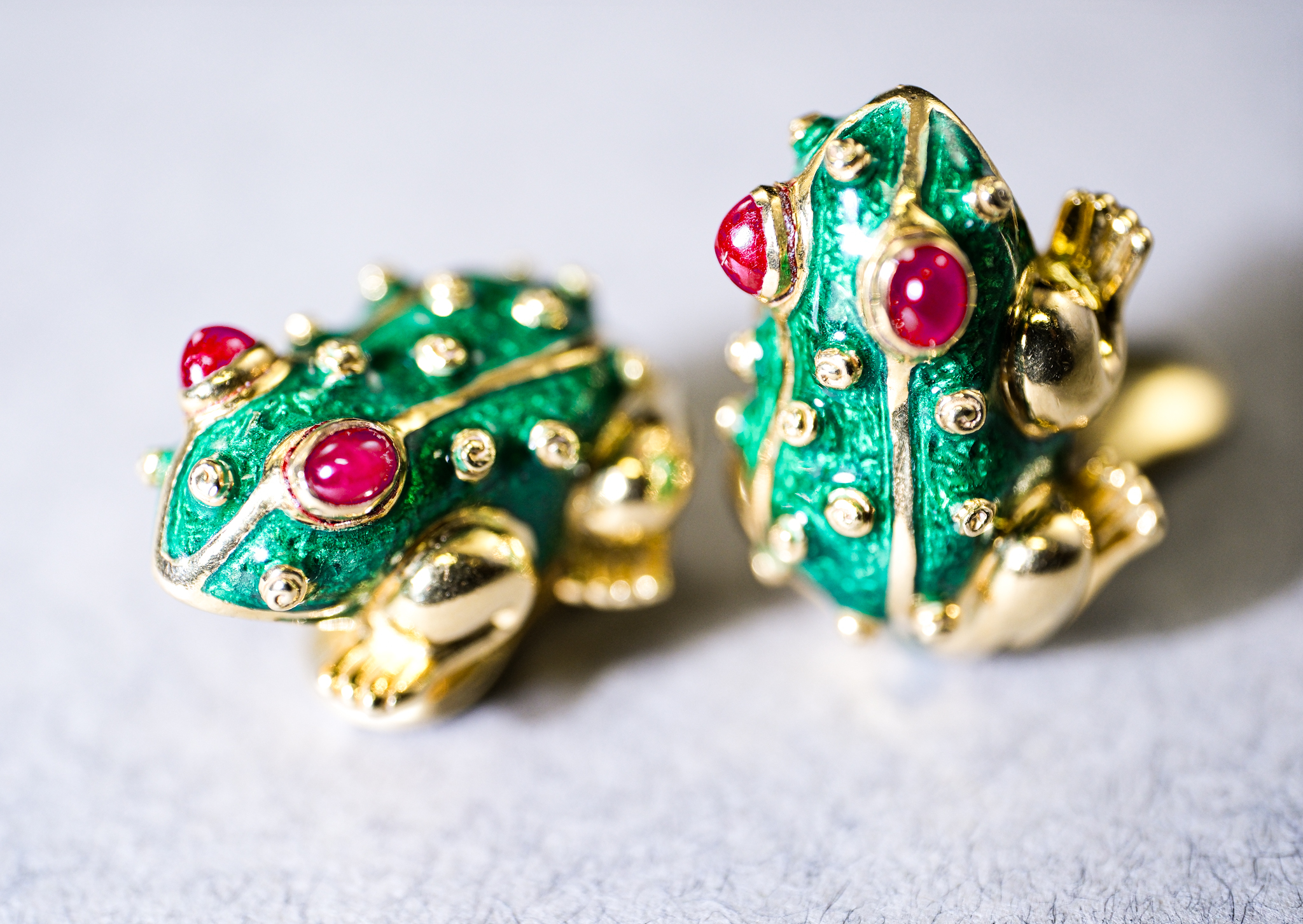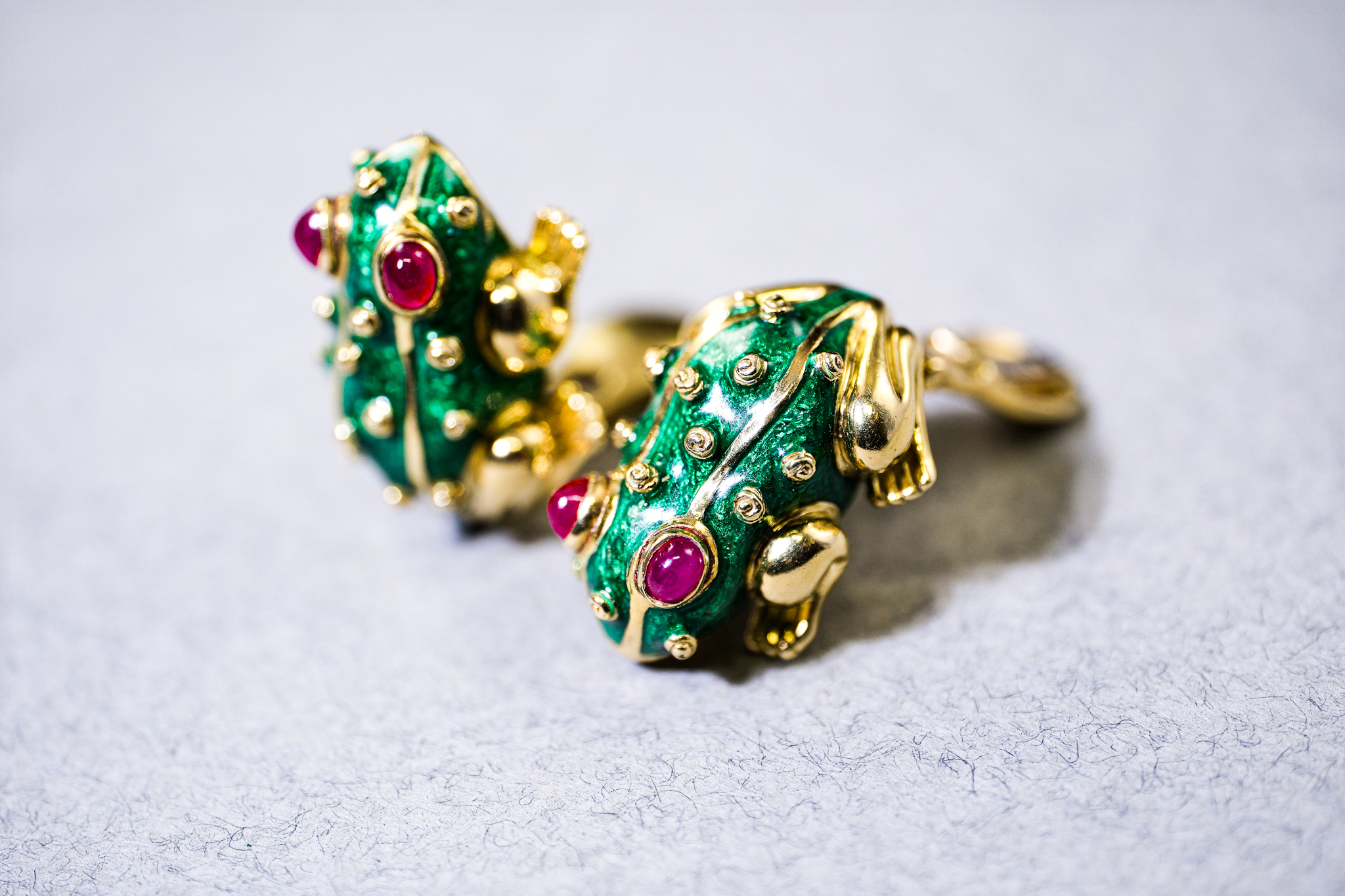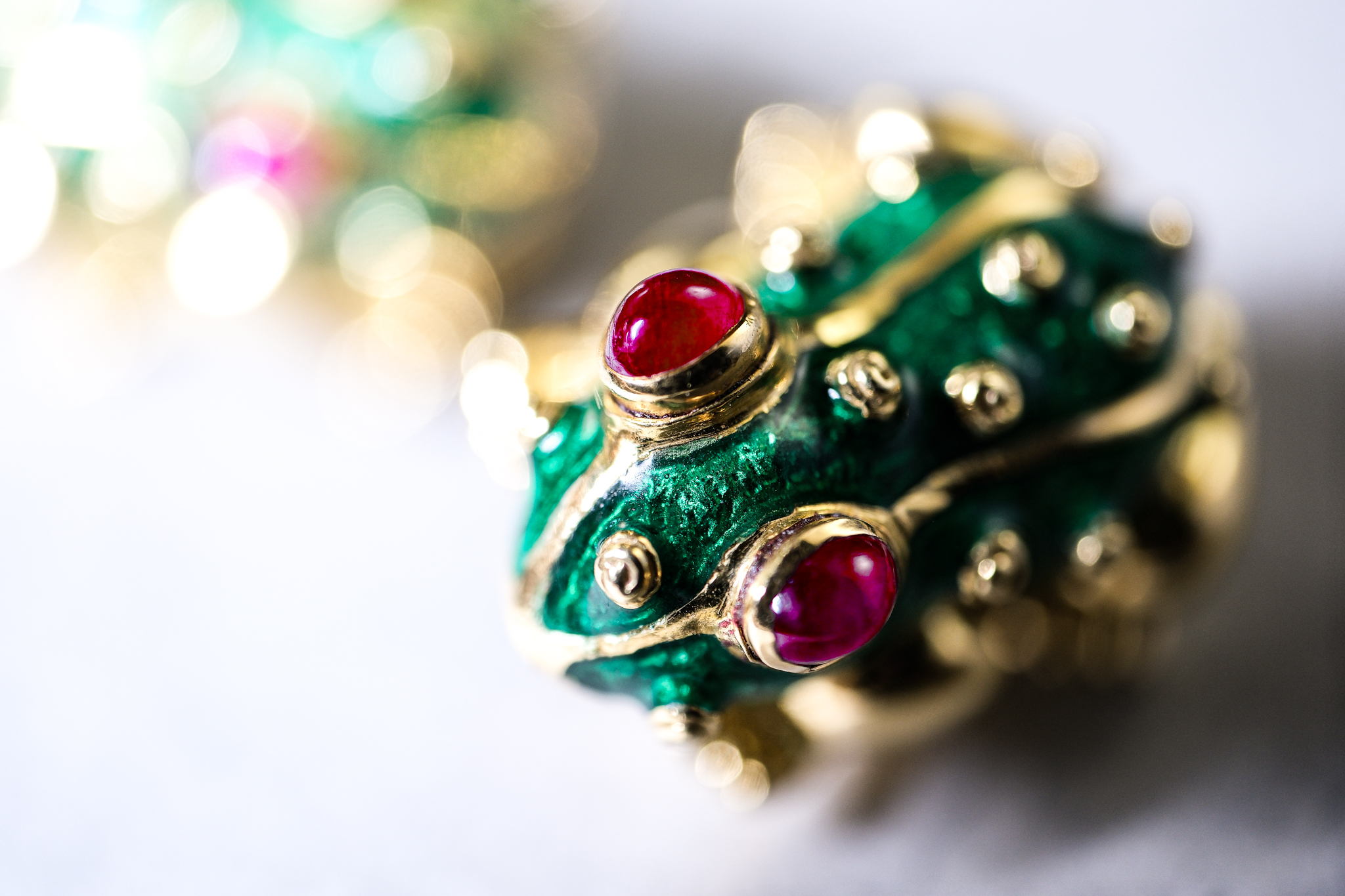 David Webb green enameled frog earclips with Cabochon Rubies from the 60s.