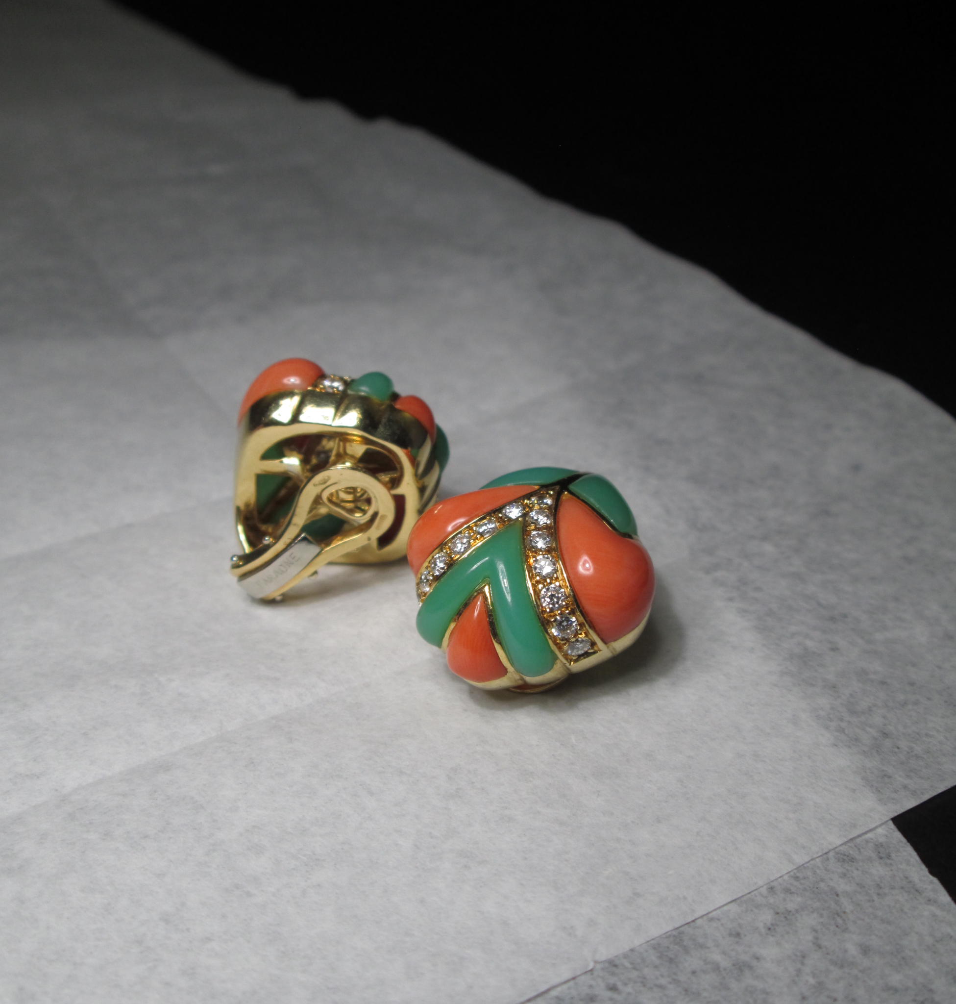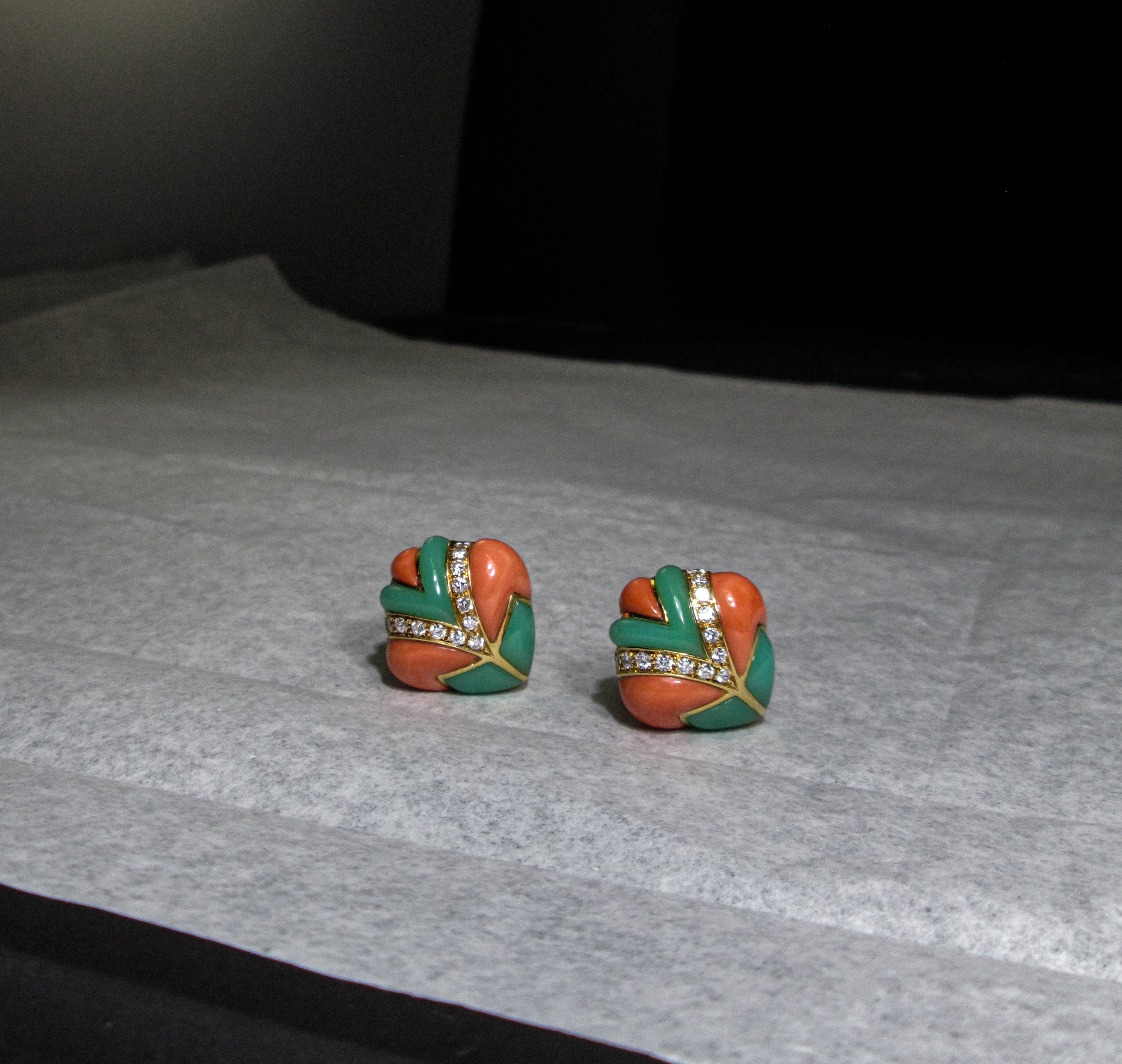 Faraone Coral and Chrysoprase earclips with Diamonds, 18k Yellow Gold