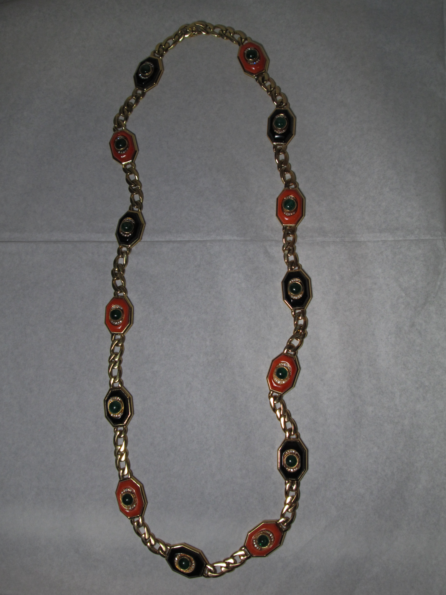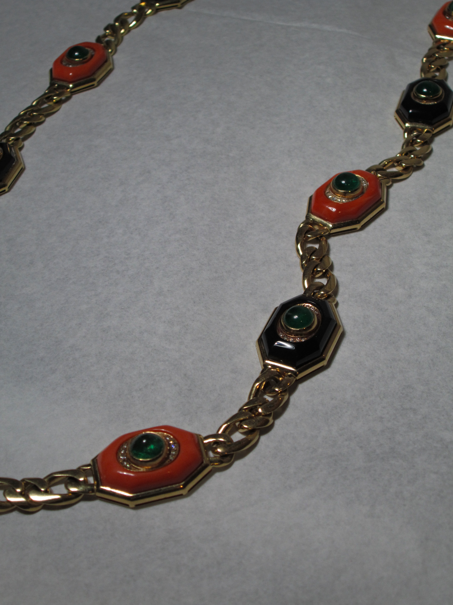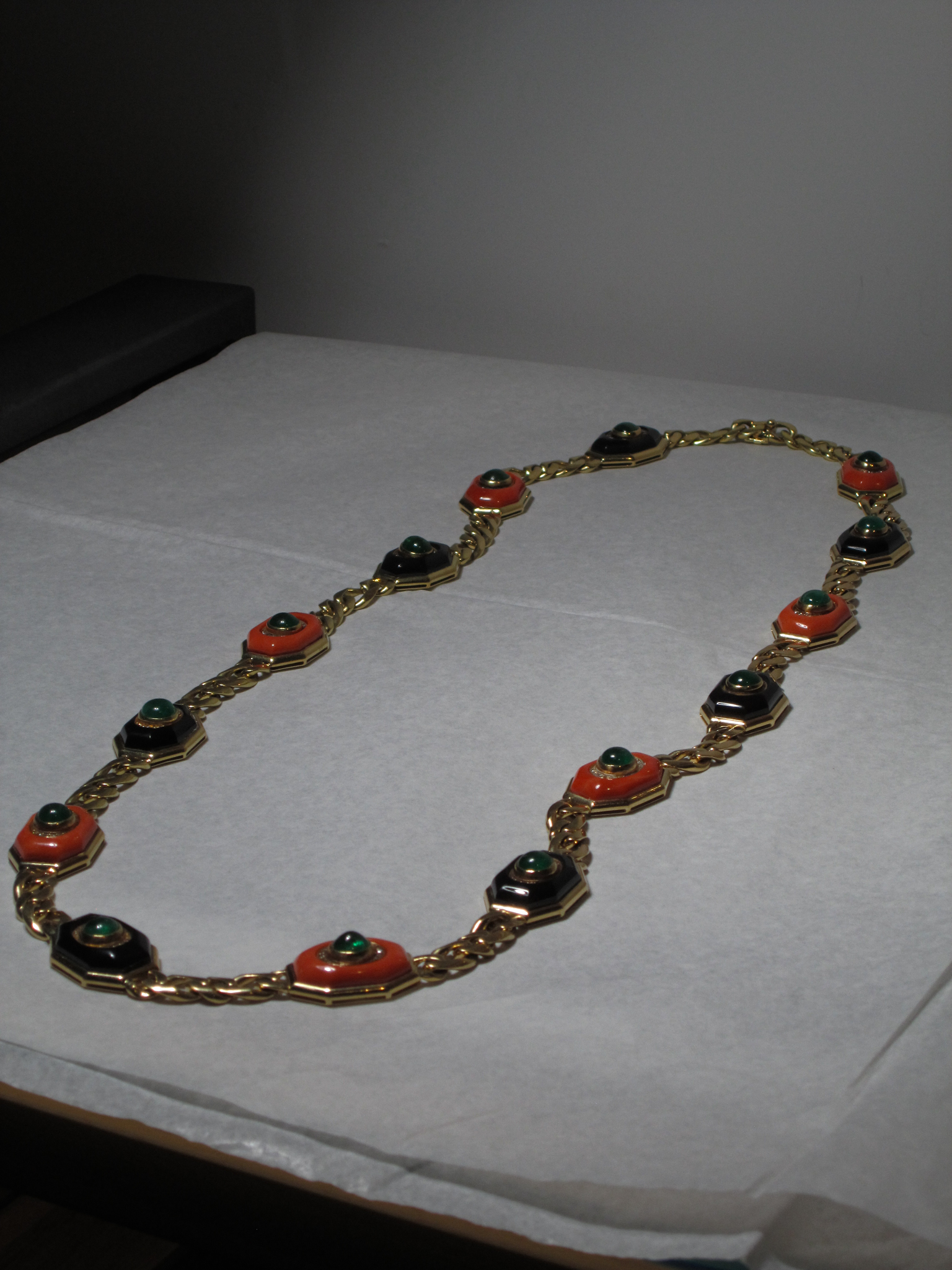 Very important Bvlgari Sautoir in Yellow Gold with Onyx & Coral elements, Cabochon-cut Emeralds, c. 1970